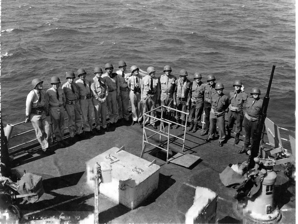 10010447 | 237k | Flag and General Officers (including LT. Gen George S. Patton, USA) aboard USS Ancon (AGC-4), Vice Admiral Henry Kent Hewitt