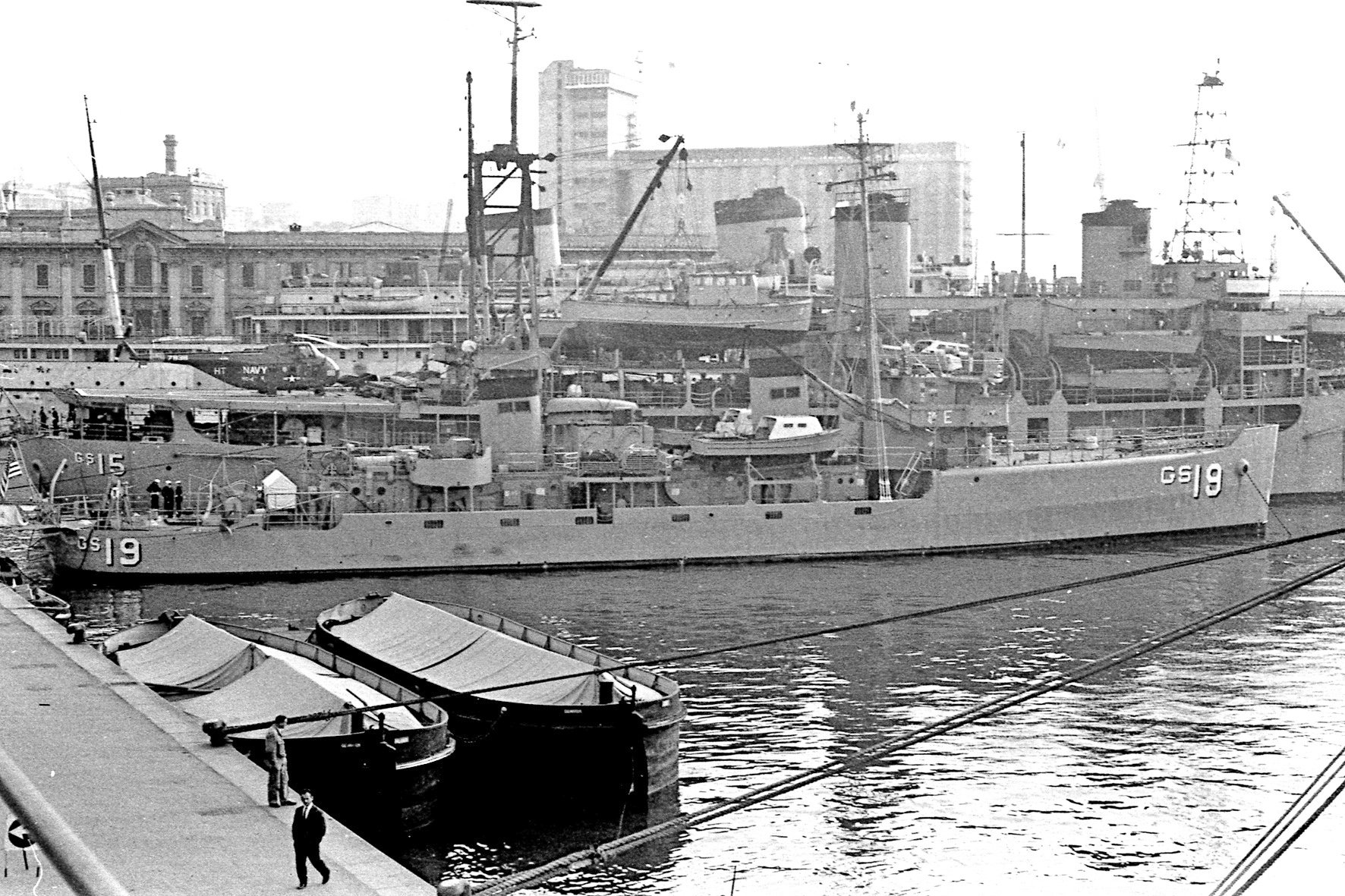 550k | USS Tanner (AGS-15) moored inboard of USS Sheldrake (AGS-19) at Genoa, Italy, 1 February 1965. | Photo by Carol Martinelli | |