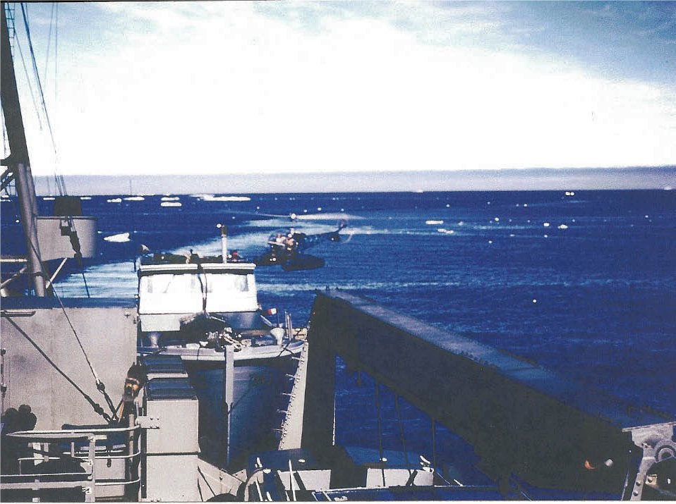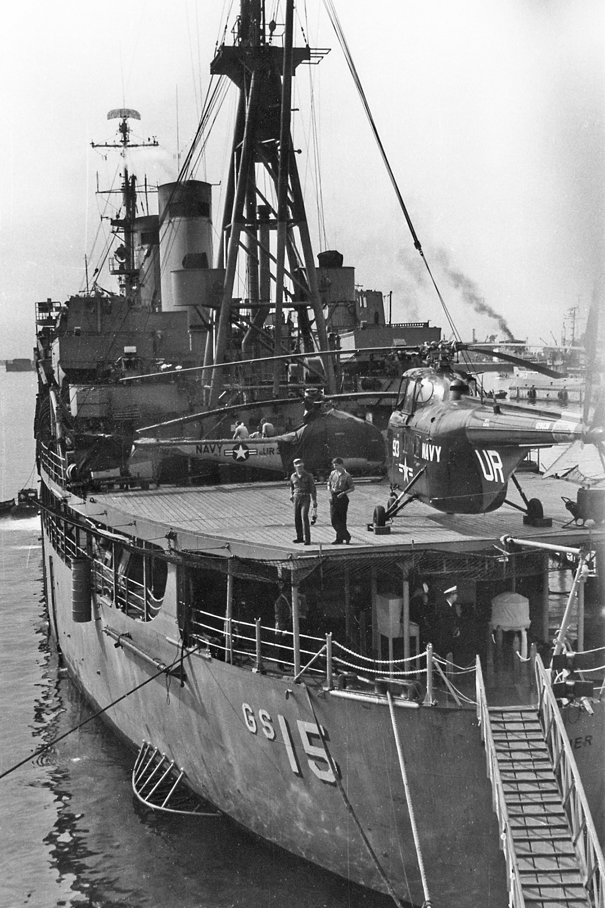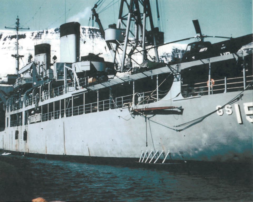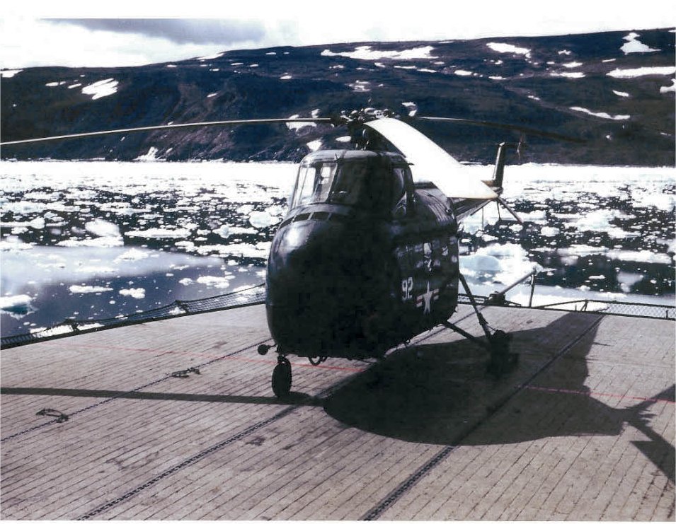 76k | USS Tanner (AGS-15) probably in northern Canadian waters. Tanner was engaged in survey operations during the summer of 1955 around Baffin Island and in Hudsons Bay. The "Chickasaw" HO4S-1 helicopter (probably BuNo 127811) belonged to the "Fleet Angels" of Helicopter Utility Squadron (HU)2 assigned to Tanner during this expedition. | Photos courtesy of the Liebrecht - Finney Collection | |