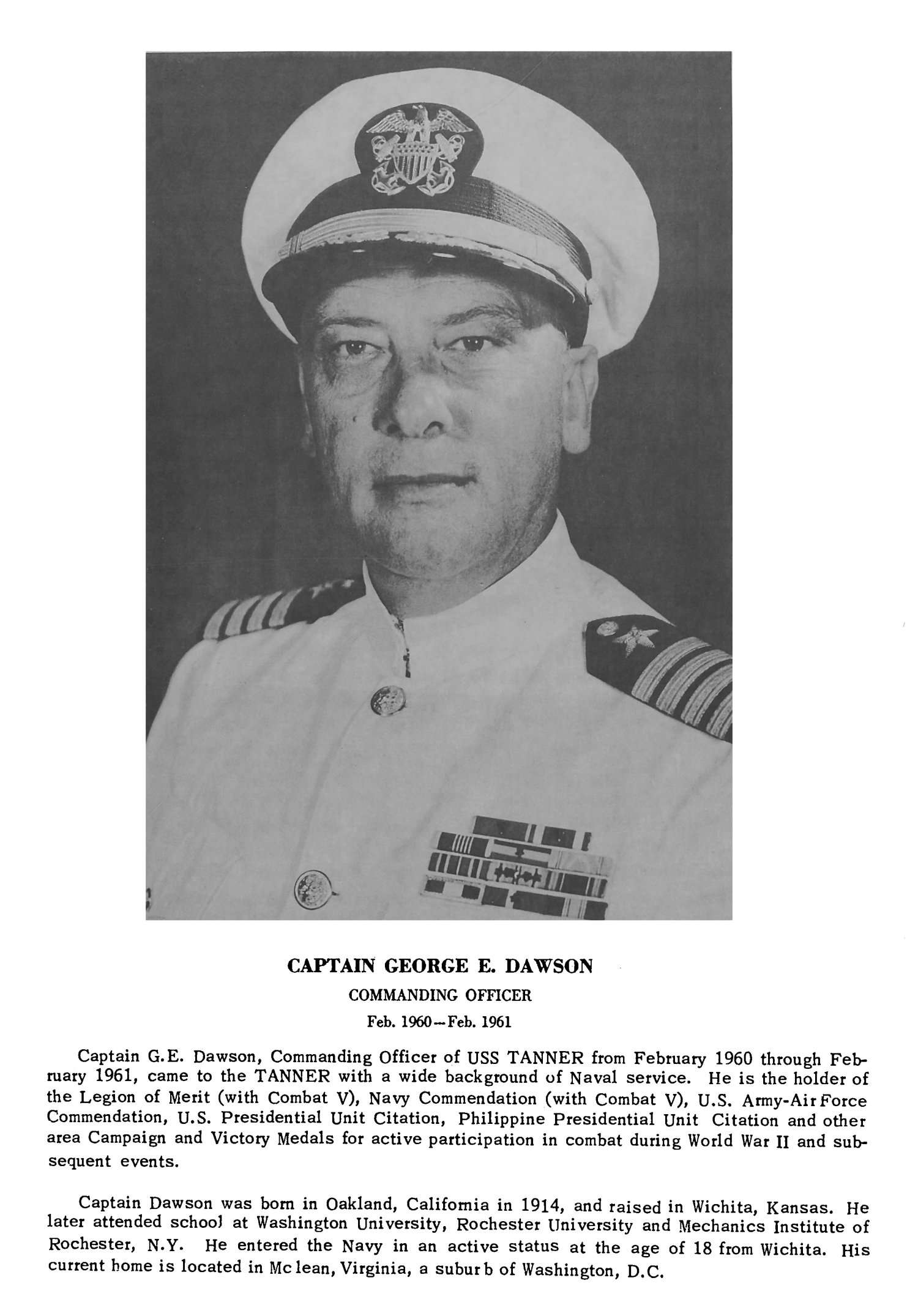| 13 | CAPT. Dawson, George Ely, USN | 26 February 1960 - 11 February 1961 | USS Tanner (AGS-15) |