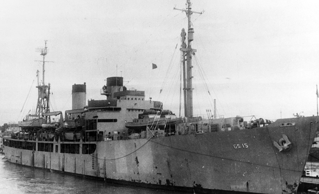 70k | USS Pamina (AKA-34) arriving at San Francisco in late 1945 or early 1946 on a Magic Carpet voyage bringing servicemen home