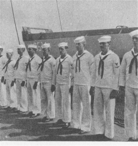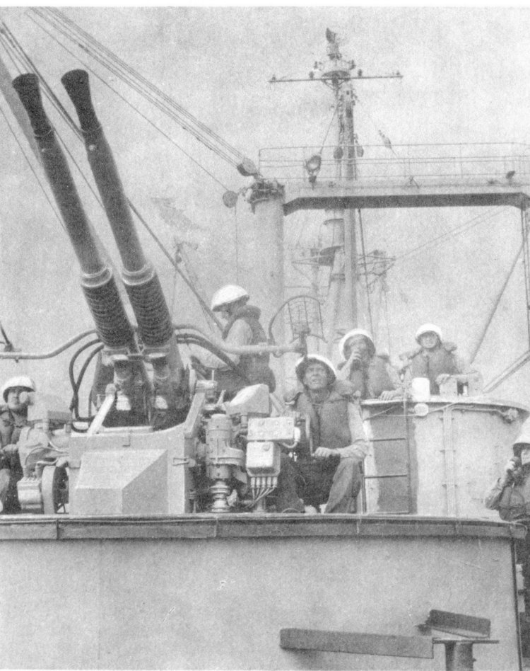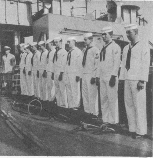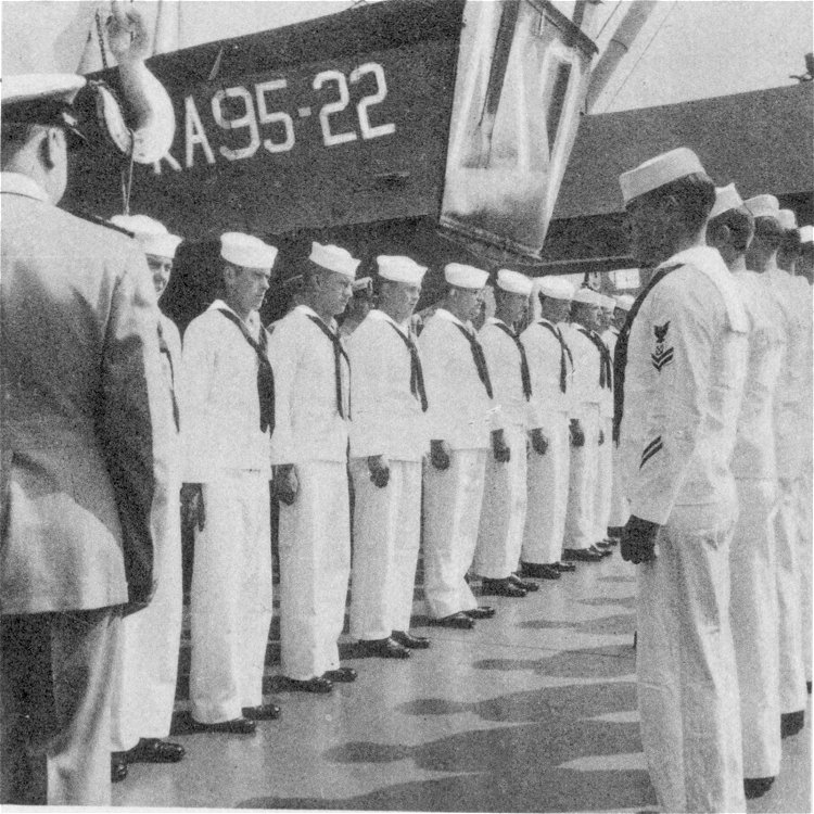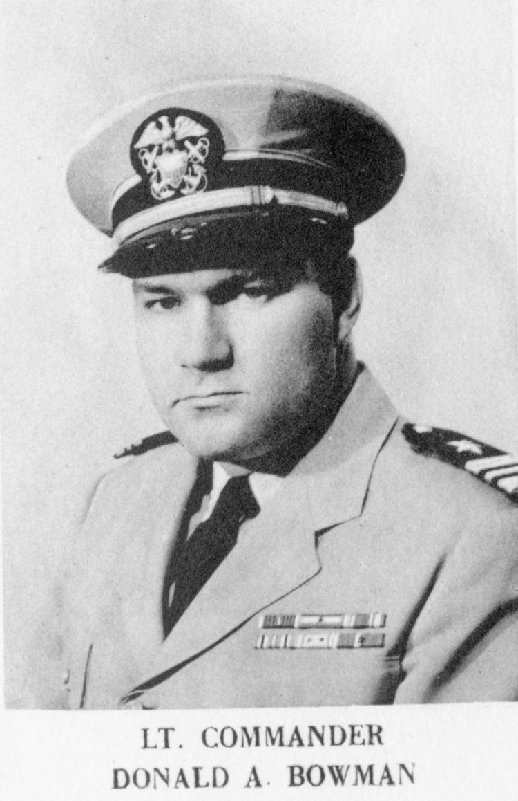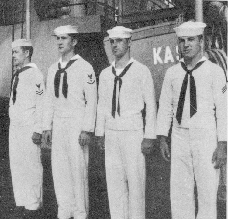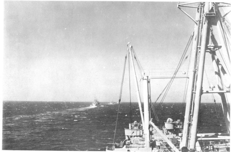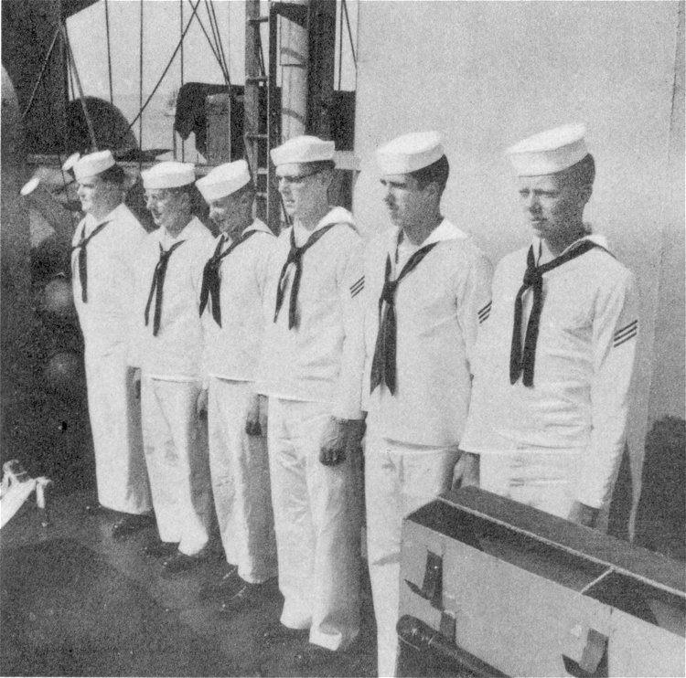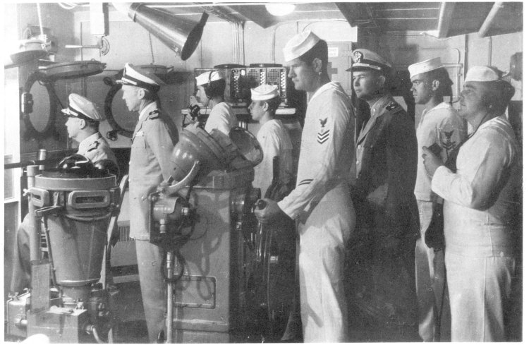 ![]() The Pilothouse with from left to right Capt. Donald Mac Donald, Cdr. John Cadwalader, XO Lt. David Dashiell, Navigator | ![]() Steaming in Formation with Randall (APA-224) and Donner (LSD-20) |