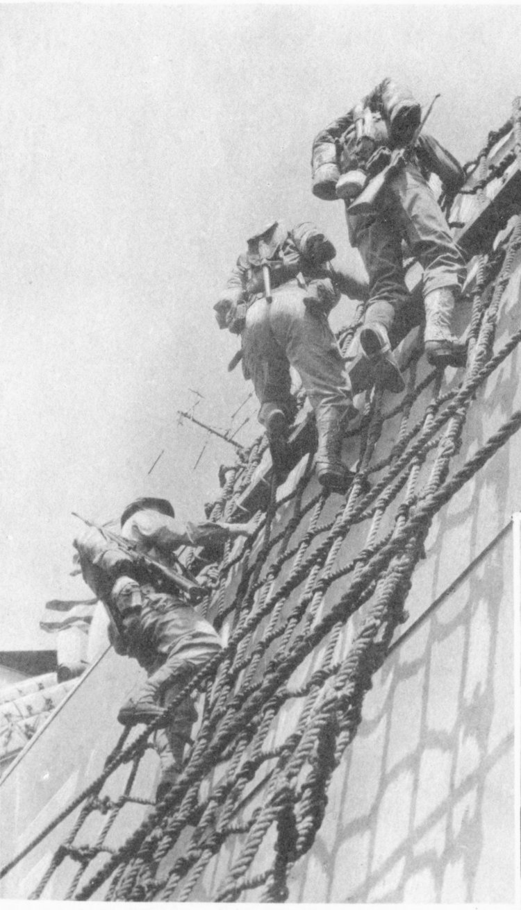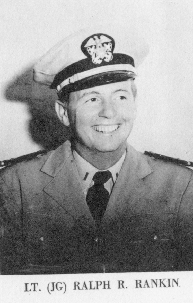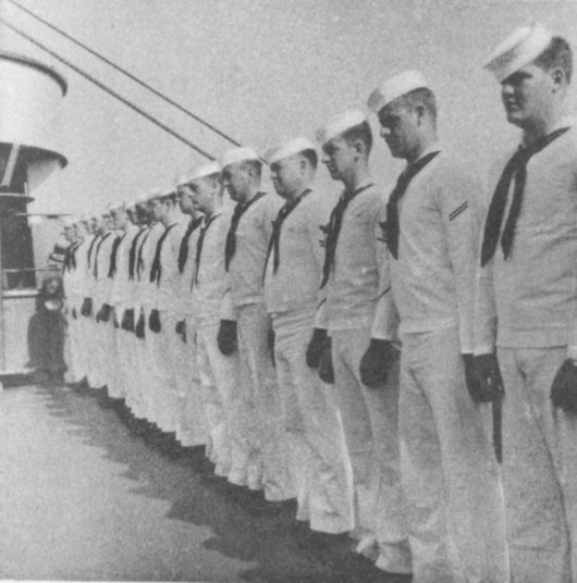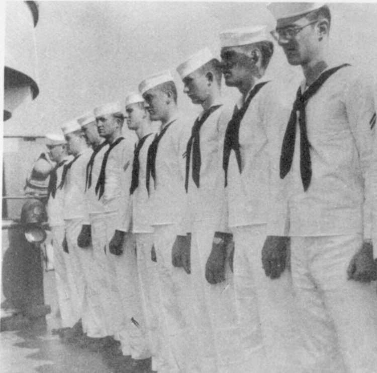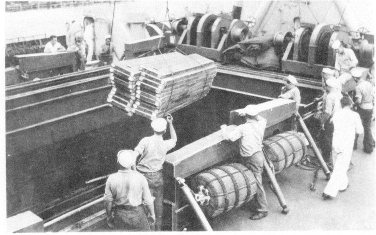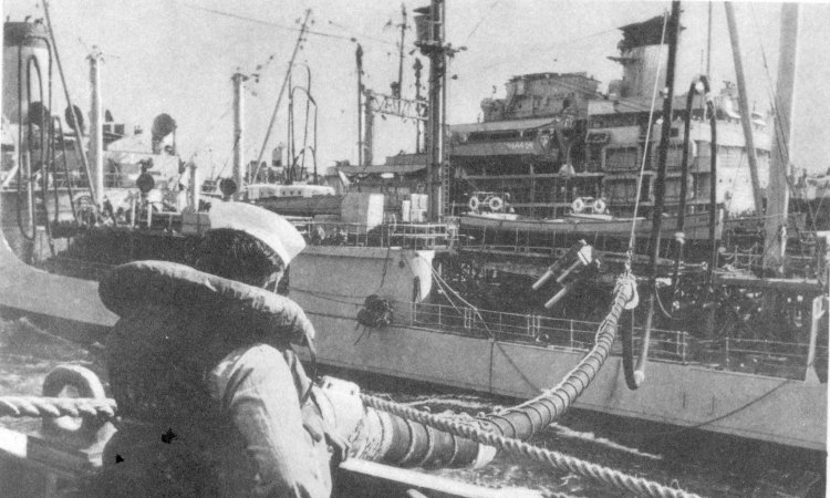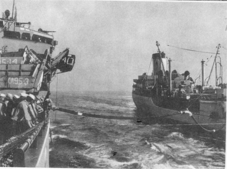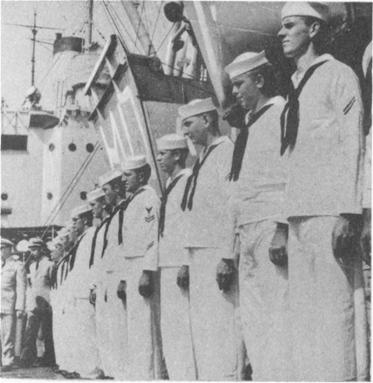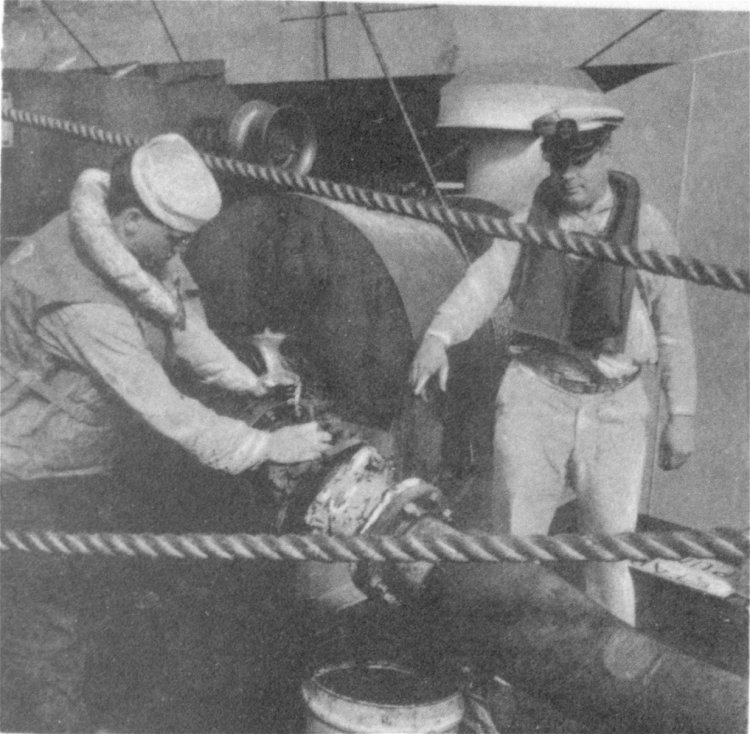 ![]() The Pilothouse with from left to right Capt. Donald Mac Donald, Cdr. John Cadwalader, XO Lt. David Dashiell, Navigator | ![]() Steaming in Formation with Randall (APA-224) and Donner (LSD-20) |