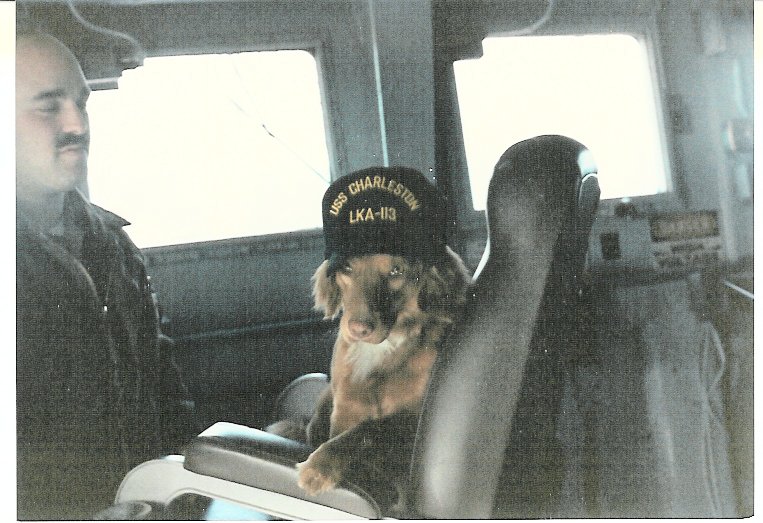 101k | "Charlene" the USS Charleston (LKA-113) mascot, 1984. Charlene was a mutt the crew rescued from the pound's death row. She was "assigned" to the ship's Navigation Department. | Photo by Bill Fessenden | |