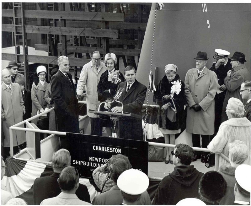 120k | Mayor J. Palmer Gaillard, Jr. of Charleston, SC at the podium prior to the launching USS Charleston (AKA-113) at Newport News Shipbuilding and Dry Dock Co., Newport News, VA. on 2 December 1967. | S. Dale Hargrave | |