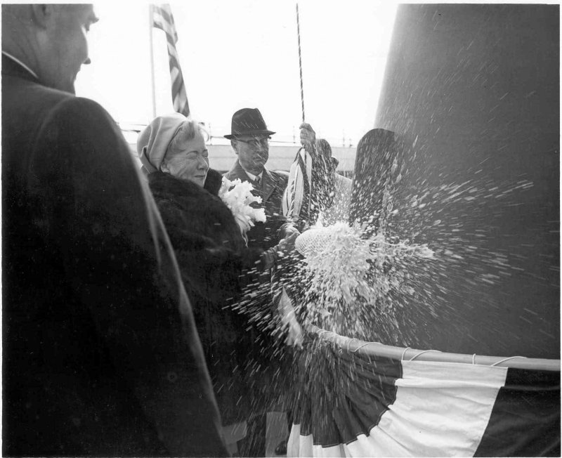 87k | The ship's sponsor, Mrs. John H. Thatch, wife of ADM. John Thatch, breaking the traditional bottle of champagne over the ships bow during the launching ceremony of USS Charleston (AKA-113) at Newport News Shipbuilding and Dry Dock Co., Newport News, VA. on 2 December 1967. | S. Dale Hargrave | |