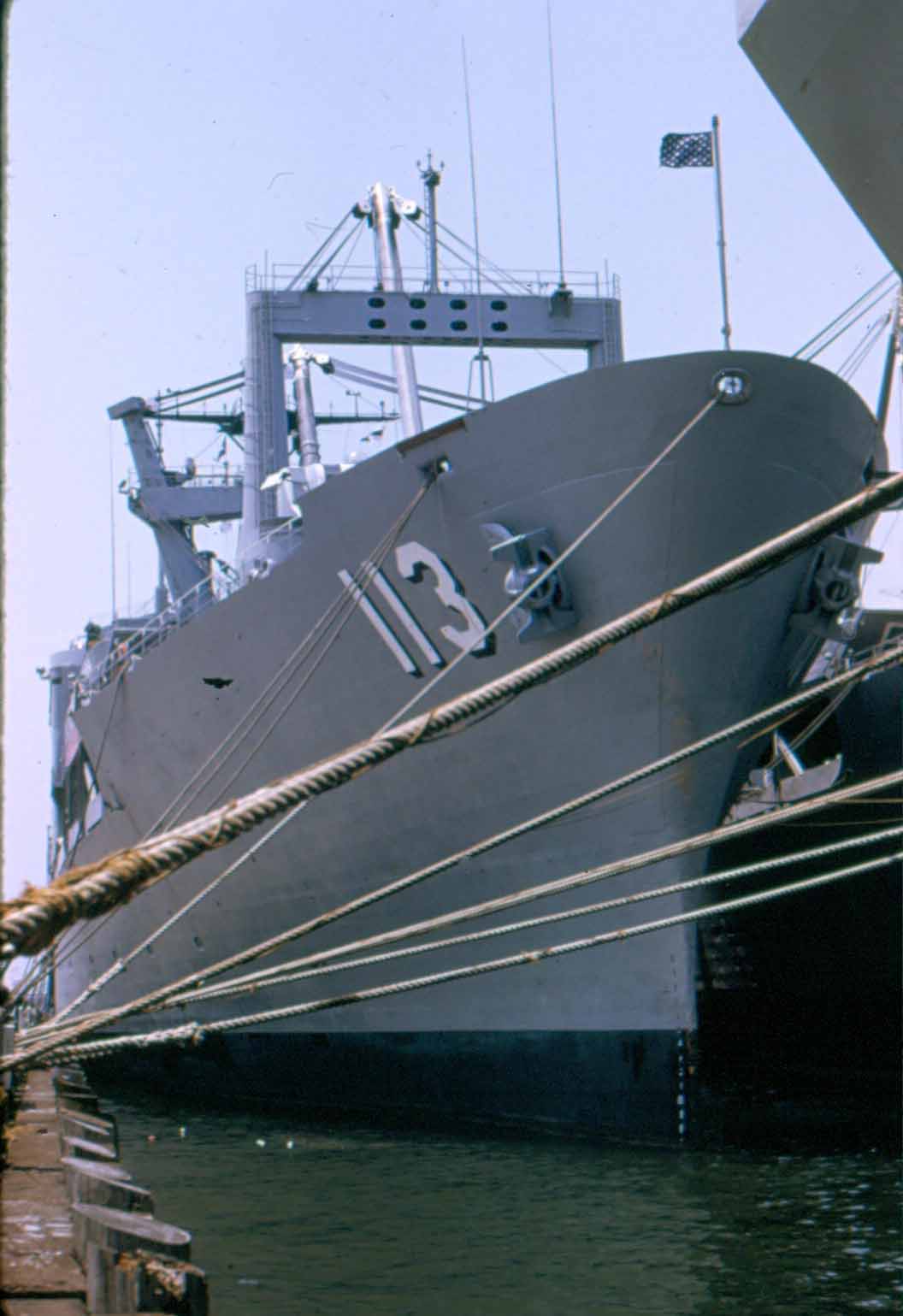 267k | USS Charleston (LKA-113) moored pierside, January 1977, location unknown.