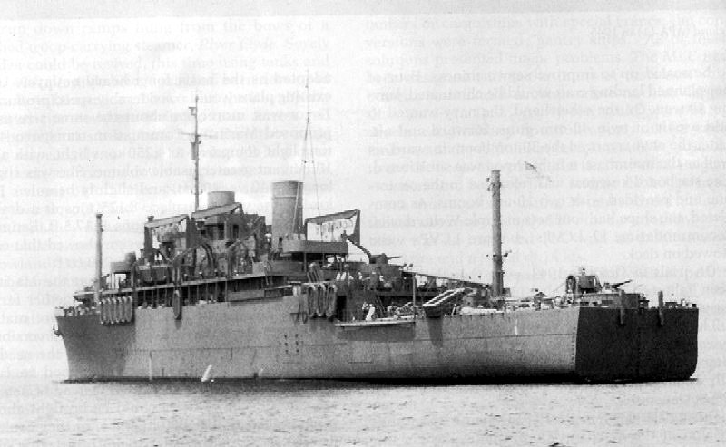 Aft view of USS Doyen (APA-1) showing her transom stern. She was designed with a stern slipway for launching an LCM(2) landing craft. By the time the ship had been completed, LCM(2) had been superseded by the larger LCM(3), and the slip was closed up to form a buoyancy space.. Text and US Navy photo from "U.S. Amphibious Ships and Craft: An Illustrated Design History" by Norman Friedman. |