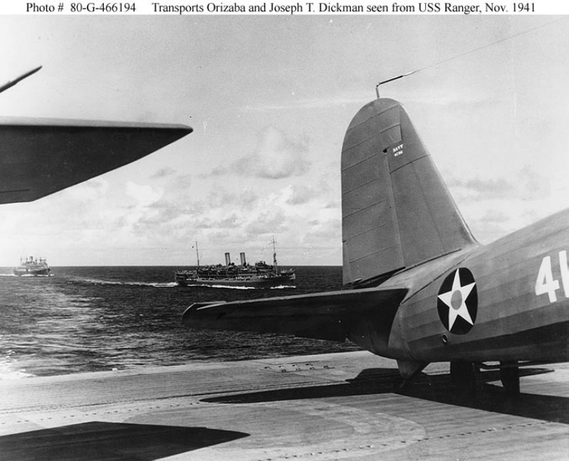 106k | Looking aft from the flight deck of USS Ranger (CV-4) is USS Orizaba (AP-24), center, with USS Joseph T. Dickman (AP-26) steaming in column astern, while en route to Cape Town, South Africa, 21 November 1941. A Vought SB2U scout bomber, of Scouting Squadron 41 (VS-41) is parked at right. Visible on the flight deck is the letter "G" of Ranger's pre-war identification marking "RNGR". US National Archives photo # 80-G-466194, a US Navy photo now in the collections of the US National Archives. |