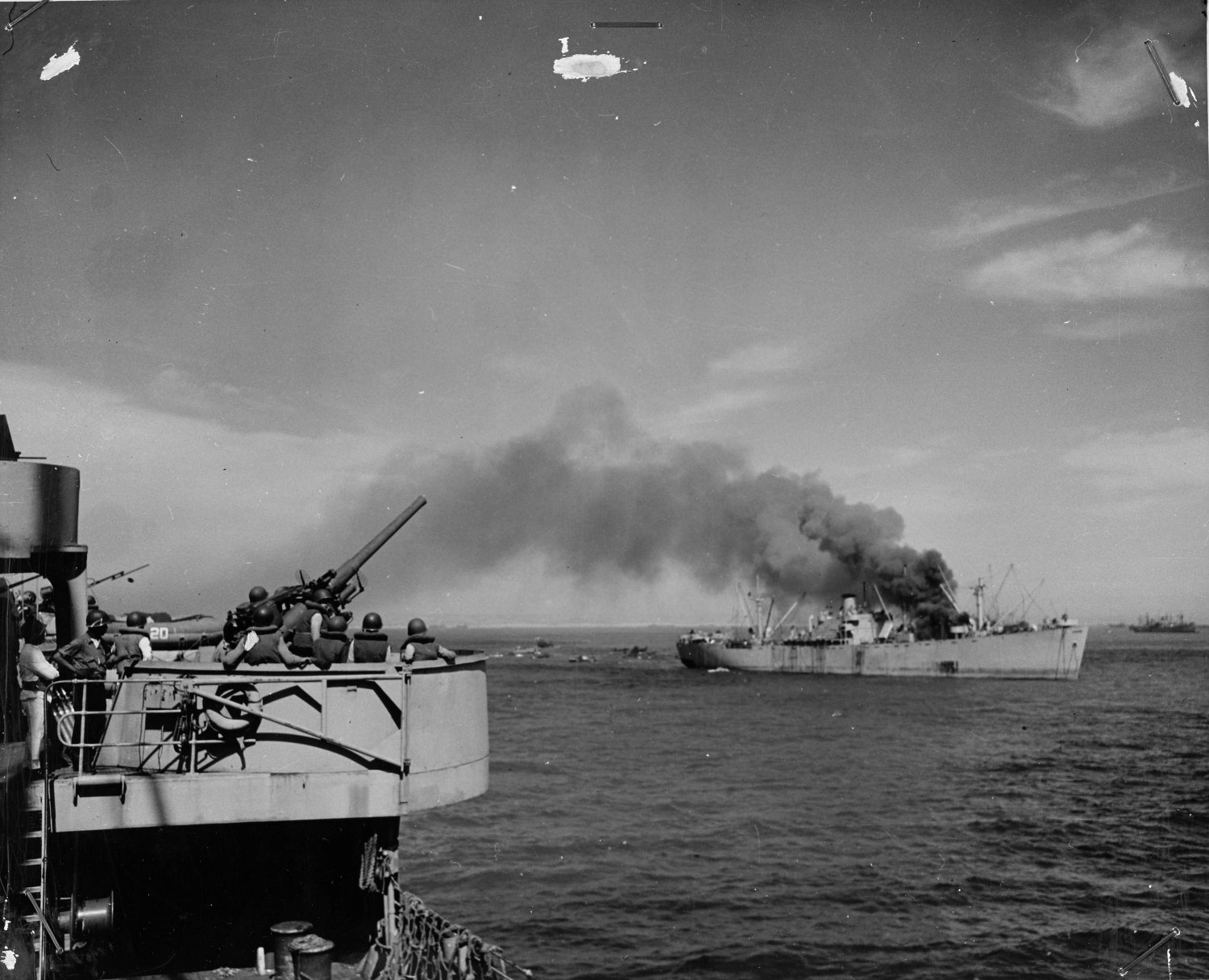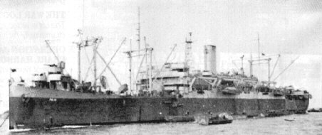 the background, probably the Liberty ship SS Robert Rowan.