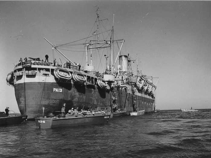 In the foreground, astern of LCT(5)-467 helping to unload the troops from the transport to the landing craft, are several LCVPs including LCVP 13-22 belonging to