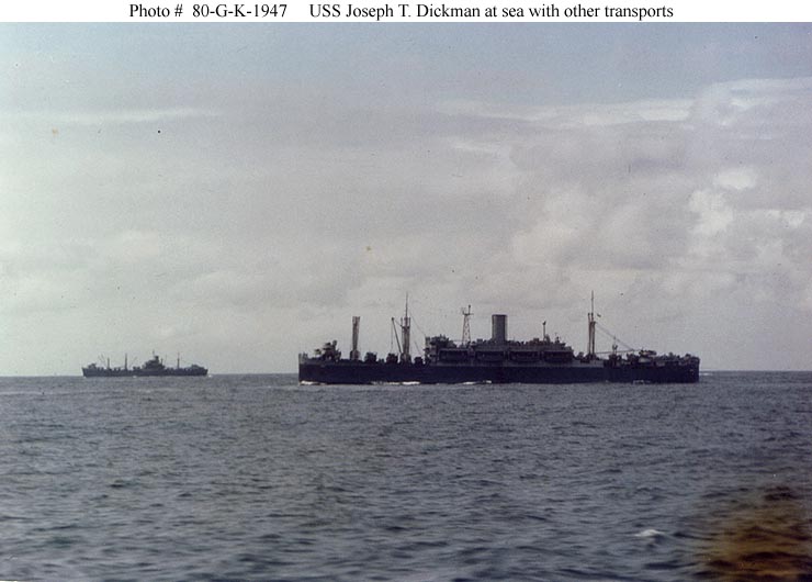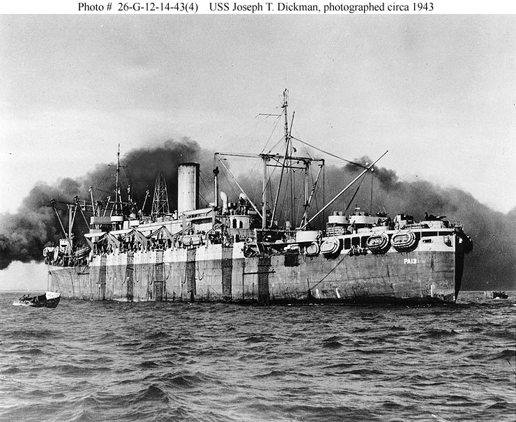 46k | USS Joseph T. Dickman (APA-13) underway, 8 April 1943, location unknown. US Navy photo. |