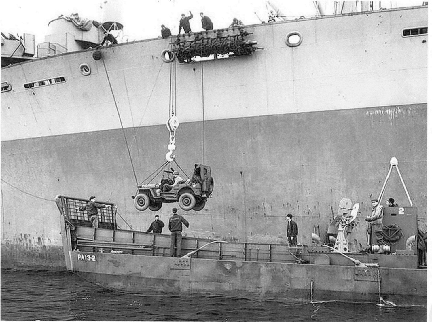 294k | USS Joseph T. Dickman (APA-13) unloading a jeep into her LCM No. 2 while anchored off the invasion beaches at Normandy, circa June 1944. | Tommy Trampp | |