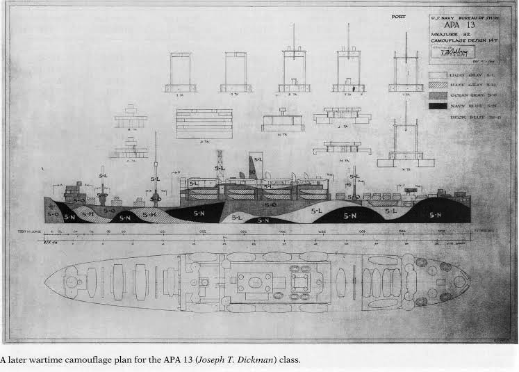 75k | Port side view of USS Joseph T. Dickman (APA-13) class camouflage Measure 32 Design 14T. US Navy Bureau of Ships photo from "U.S. Amphibious Ships and Craft" by Norman Friedman. |