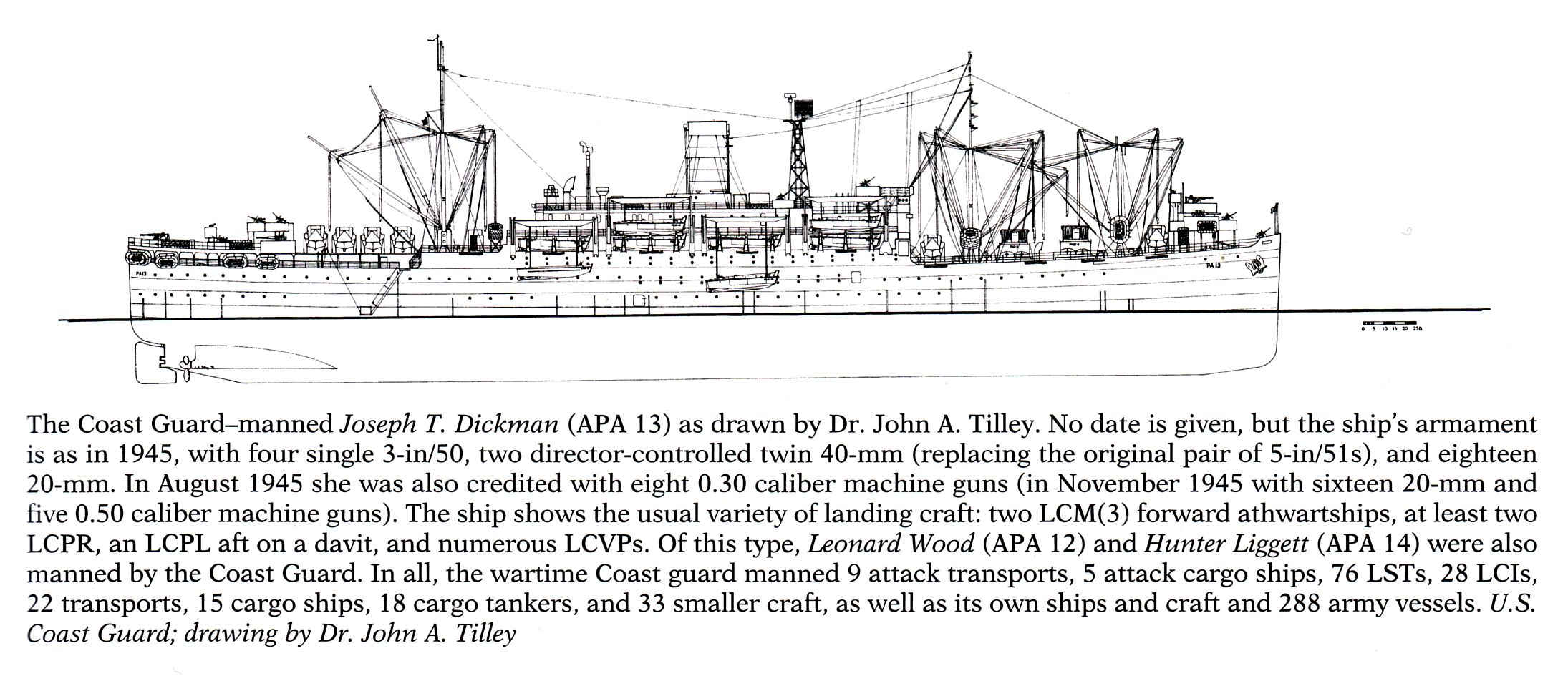 333k | Drawing of USS Joseph T. Dickman (APA-13) showing 1945 armament configuration. By Dr. John A. Tilley from "U.S. Amphibious Ship and Craft" by Norman Friedman. |