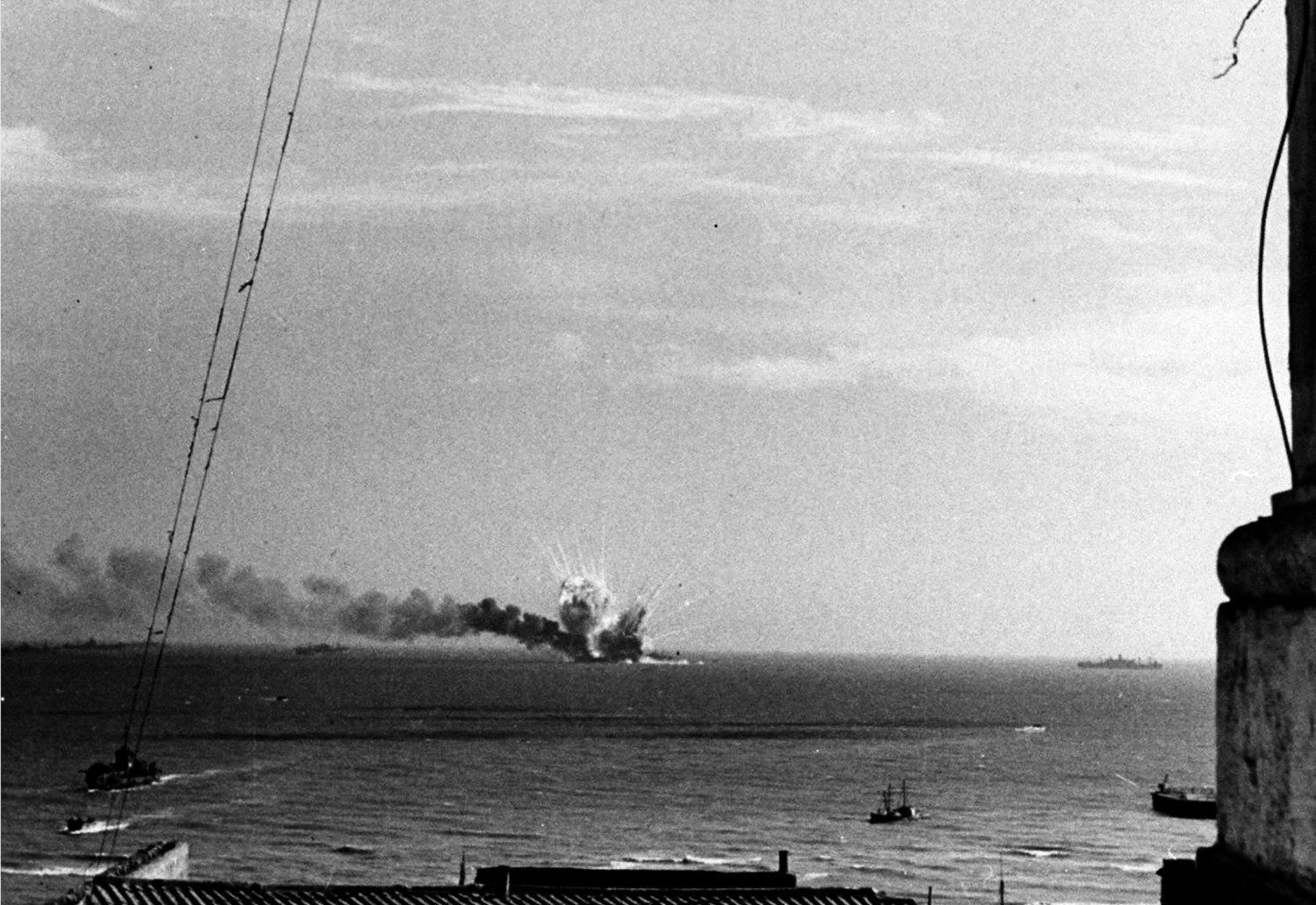 1943. German dive bombers in an air raid on the convoy hit the Liberty ship SS Robert Rowan. The fire, started by bombs dropped amidships, spread rapidly to the ship's munitions supply, which exploded to form dangerous though picturesque patterns across the