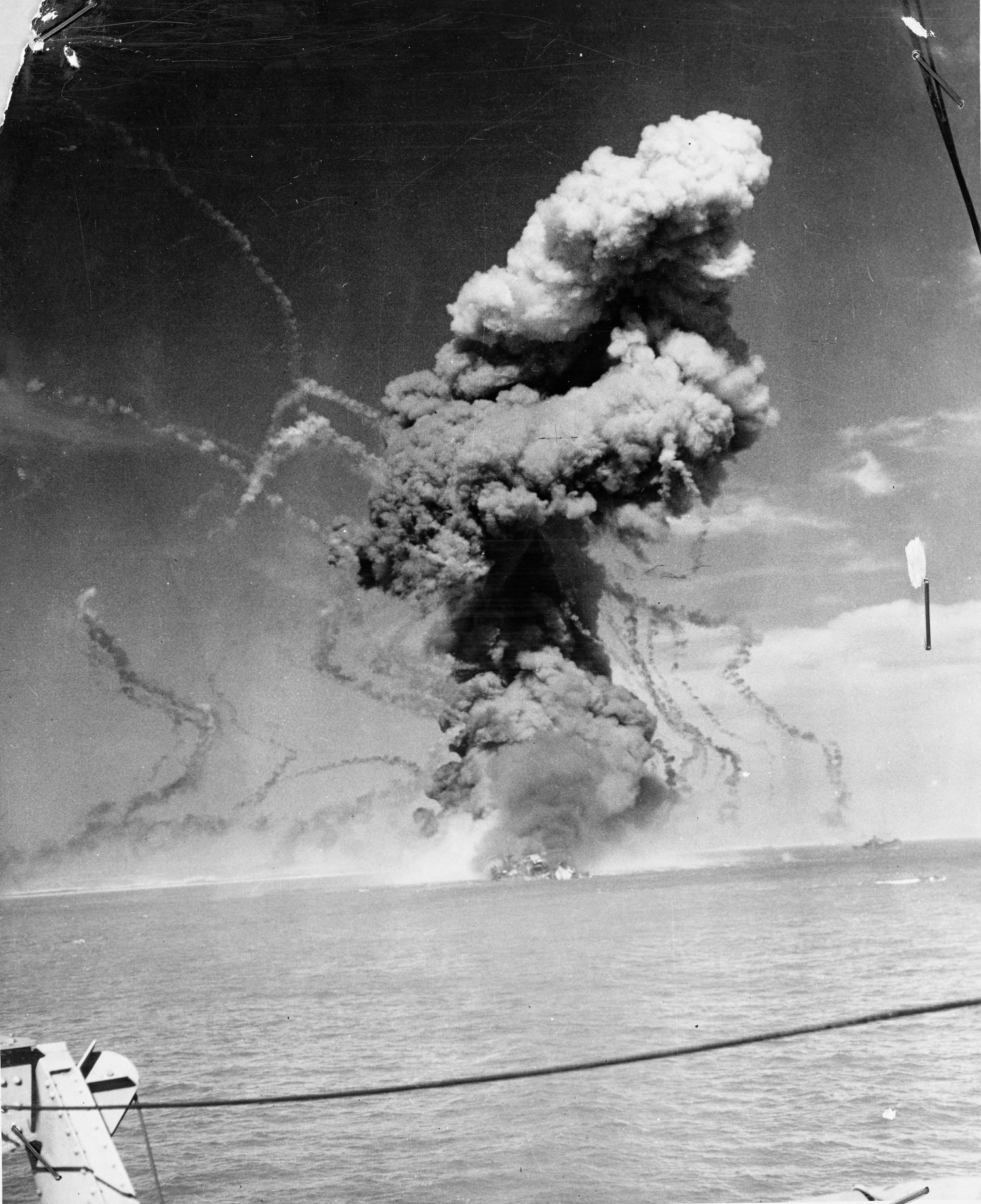 to 4" in diameter and many dents and small holes in the superstructure. Ship in the background is (probably)