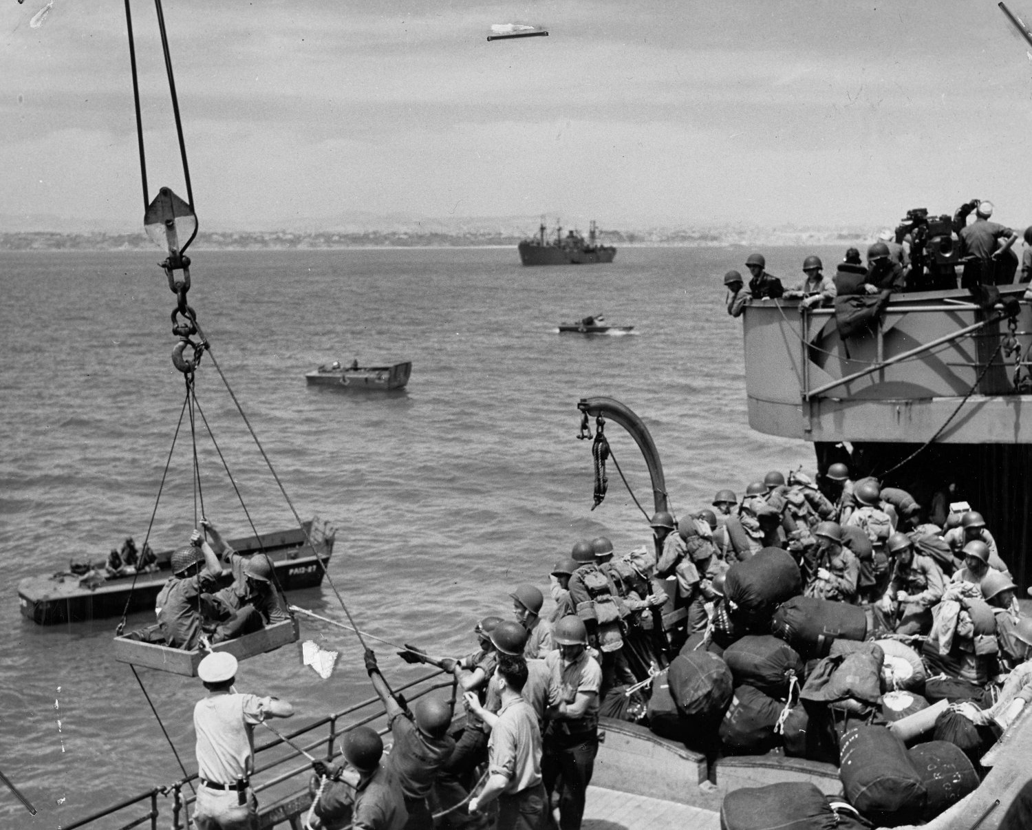 USS Joseph T. Dickman (APA-13) loaded with infantry on there way ashore.