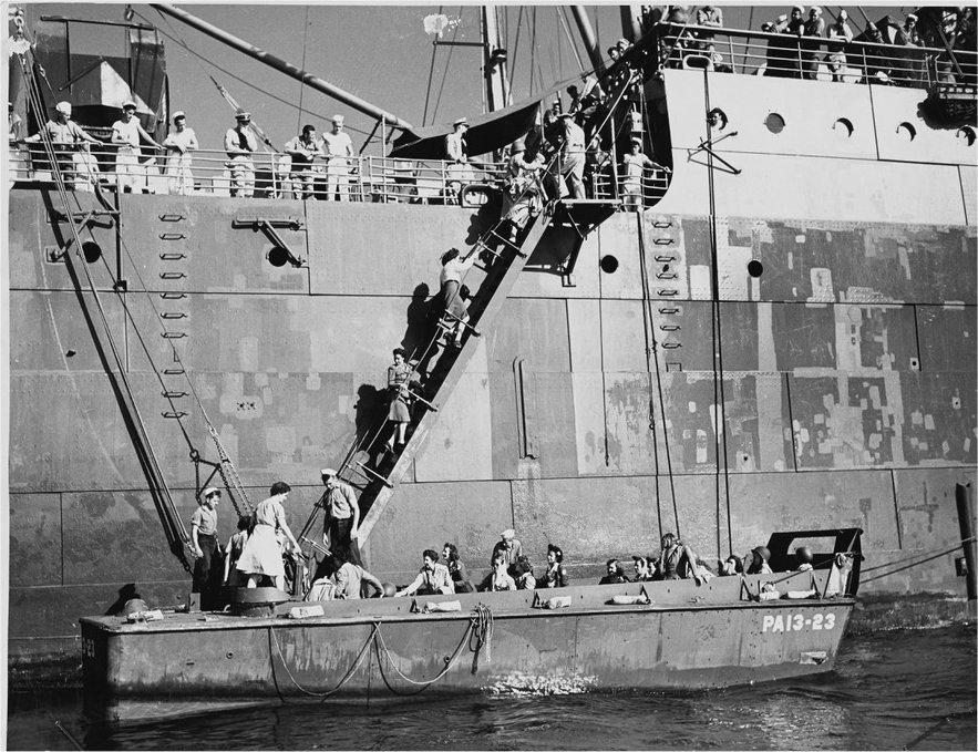 173k | Red Cross ladies boarding USS Joseph T. Dickman (APA-13) at an unknown location for a voyage to Southern France, circa 1944. Red Cross workers