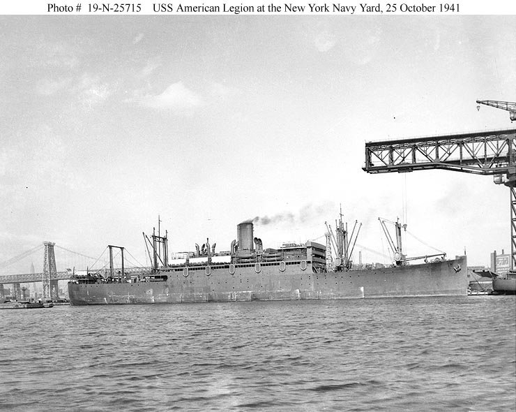 94k | USS American Legion (AP-35) at New York Navy Yard, Brooklyn, New York, 25 October 1941. Note her weathered dark gray camouflage paint, with white canvas lifeboat covers. US National Archive photo # 19-N-25715, a US Navy photo from the Bureau of Ships Collection now in the National Archives. |