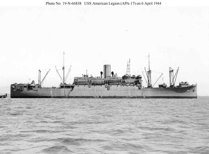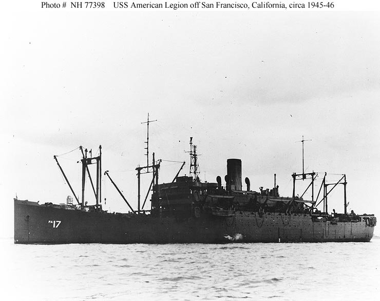 58k | USS American Legion (APA-17), off San Francisco, CA., in 1945-46, probably after the end of World War II. Note that her forward guns have been removed. US Navy photo # NH 77398, from the Collection of Donald M. McPherson, 1973, at the US Naval Historical Center. |