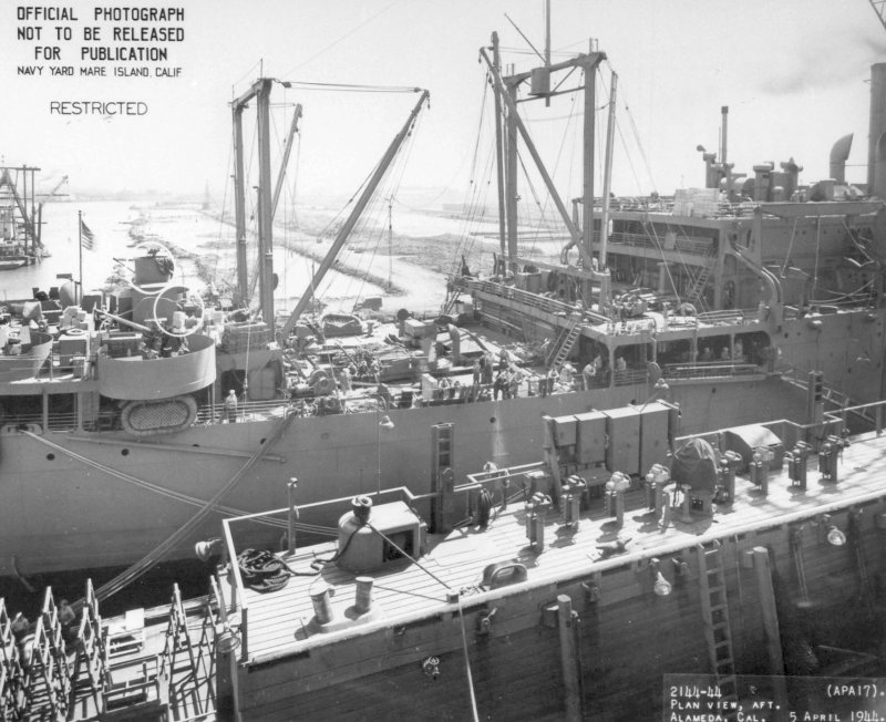 90k | Forward plan view of USS American Legion (APA-17) at Alameda, CA., 5 April 1944 Navy Yard Mare Island photo # 2147 |