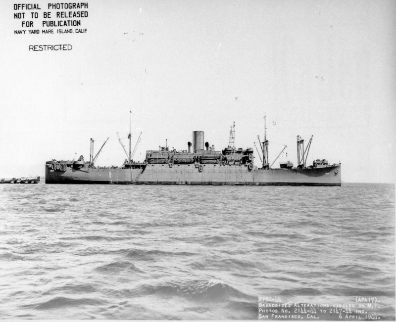 88k | Broadside view of USS American Legion (APA-17) in San Francisco Bay, 6 April 1944, after receiving alterations