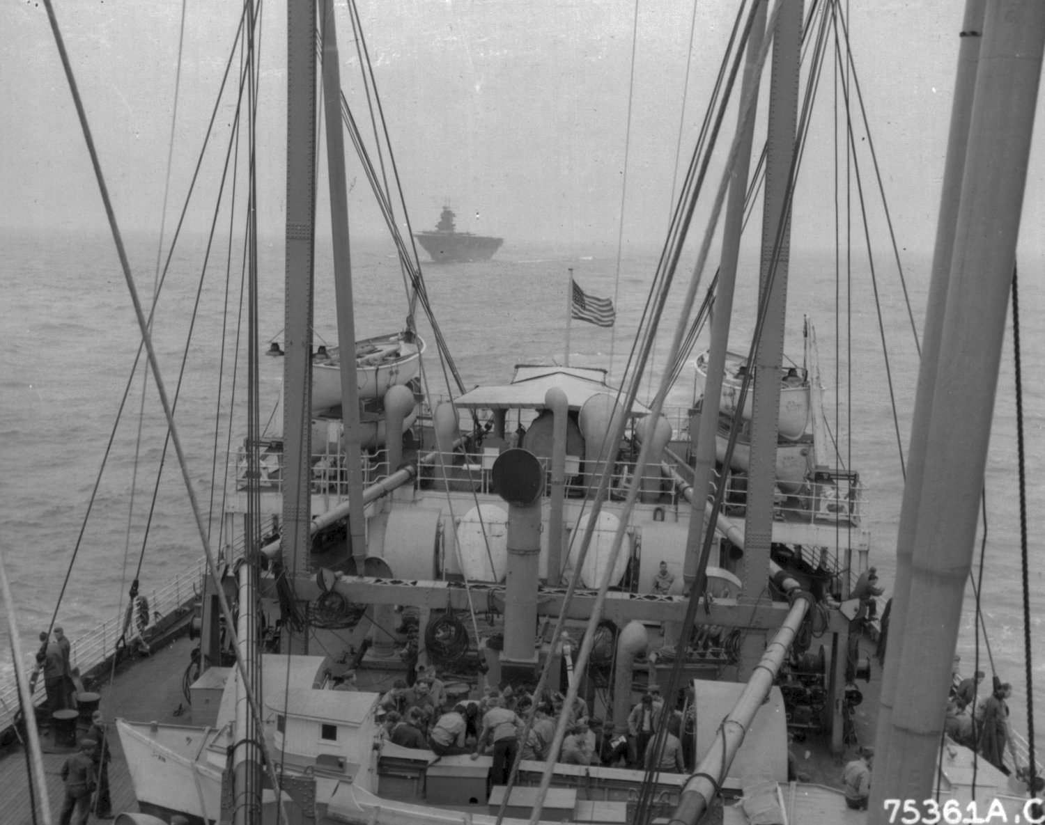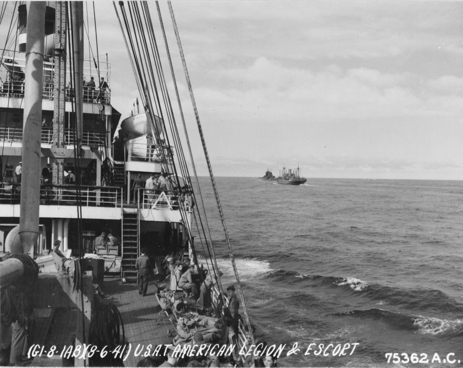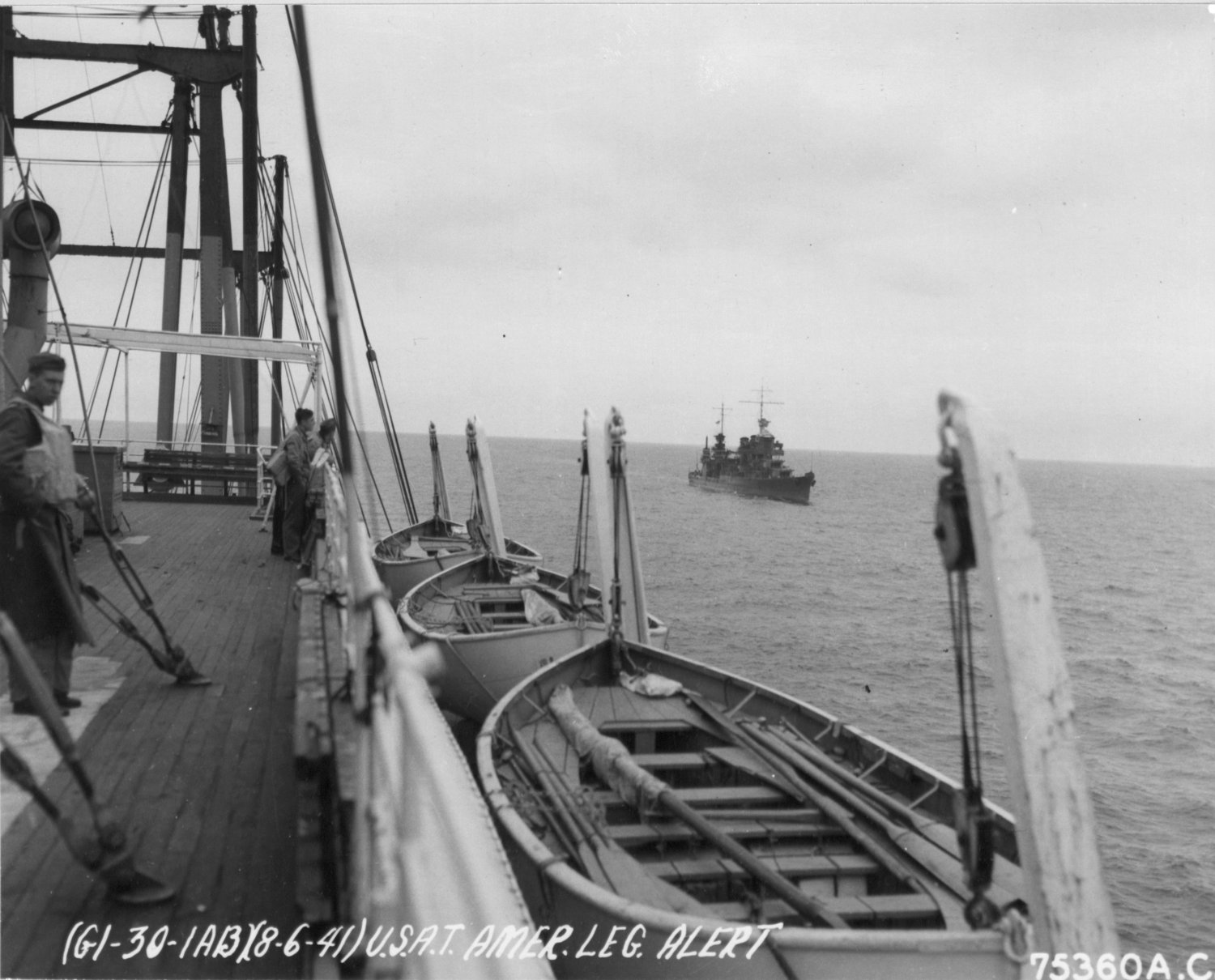 247k | U.S. troops on board USAT American Legion enroute to Iceland. 6 August 1941. In the background, astern of American Legion, is