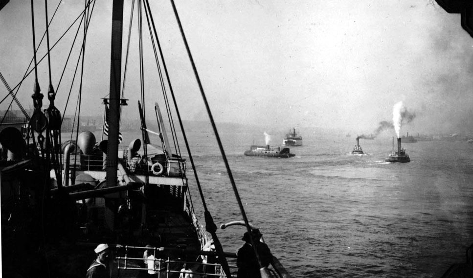 100301725 | 103k | Munson Line passanger ship SS American Legion being towed on the River Plate at Buenos Aires. Aragintina, 1926. She was participating in the 2nd