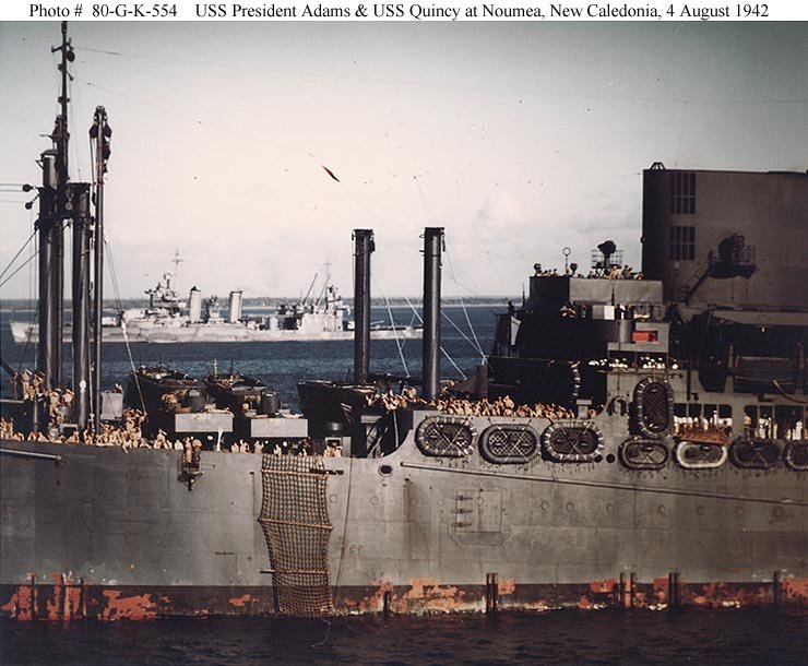 98k | USS President Adams (AP-38) photographed from USS Wasp (CV-7), at Noumea, New Caledonia, 4 August 1942. She is crowded with US Marines, bound for the invasion of Guadalcanal. USS Quincy (CA-39) is in the background. US National Archives photo # 80-G-K-554, a US Navy photo now in the collections of the US National Archives |