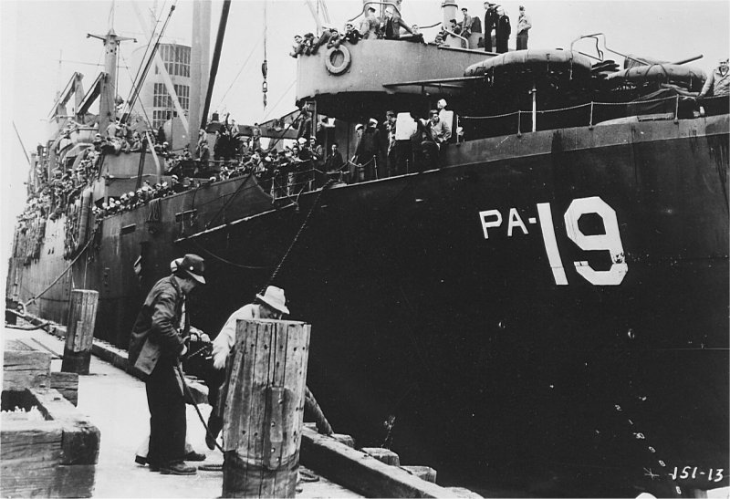 101k | USS President Adams (APA-19) arriving on the West Coast with returning veterans during "Magic Carpet" operations, date and location unknown. | David Buell | |
