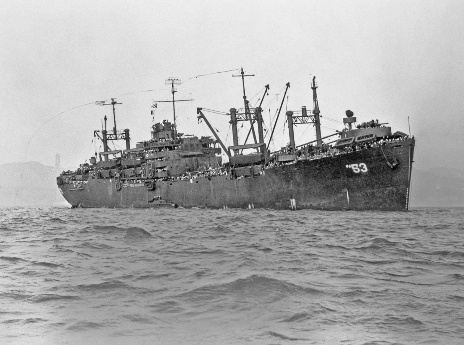 253k | USS Warren (APA-53) flying a "Homeward Bound Pennant" as she enters San Francisco Bay, 17 December 1945. Note the north tower of the Golden Gate Bridge in