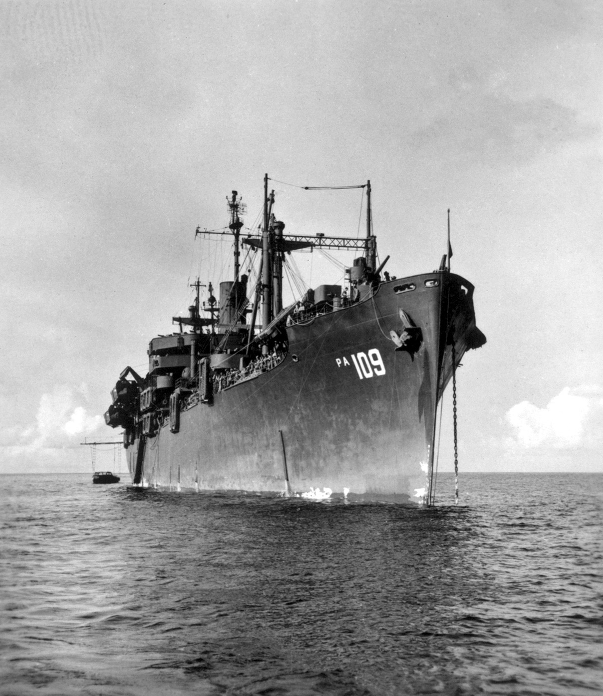 109k | USS Grafton (APA-109) anchored at Kossol Passage, Palau, 14 May 1945. "Colors at halfmast colors rendered upon death of President" (Franklin Delano Roosevelt died 12 April 1945). | Submitted by Dan Patterson for his father ENS. Dee Patterson USS Grafton | |||||||||||