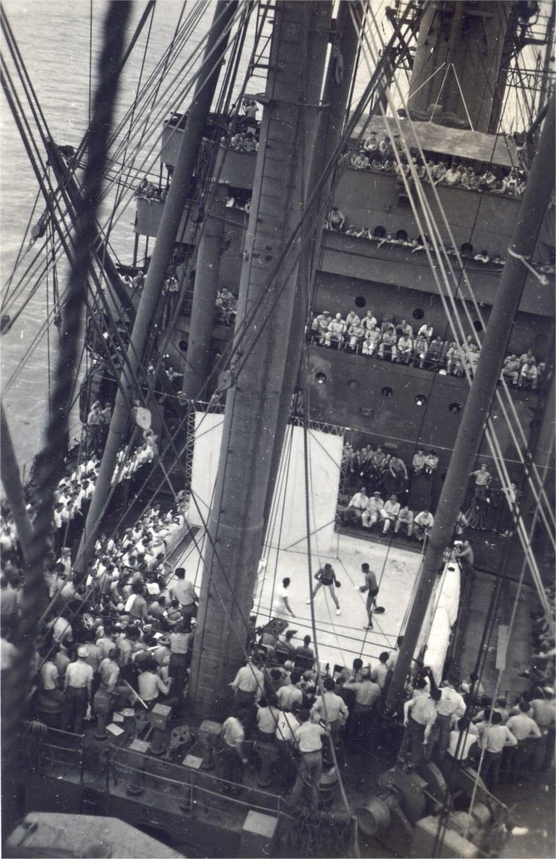 212k | Probably a boxing match between crew members of USS Grafton (APA-109) and crew members of USS Crockett (APA-148) at Angaur Island, Palaus Islands, Western Caroline Islands Group the week of 3 June 1945. In the ring is USS Grafton's Cox’n, George Vernon Whyte USN, Pacific Fleet middleweight champion. | Submitted by John Dupre' for his father-in-law CWO-2 Edmund H. Cokely USN, Asst Electrical Officer USS Grafton. | |||||||||||