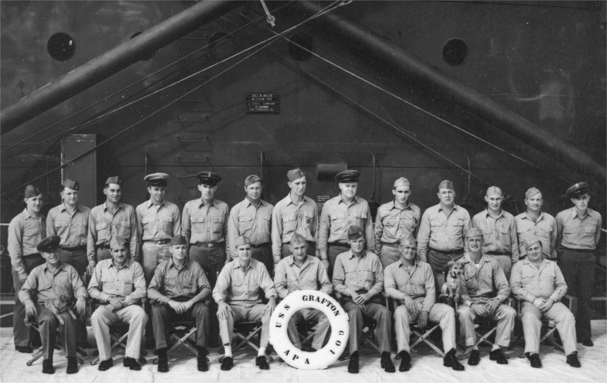 369k | USS Grafton (APA-109) Officers and Chief Petty Officers and the ship's mascot Half Hitch. Half Hitch was a pet of the carpenters and lived in their shop. Note on the rear bulkhead the builders plate that identifies Western Pipe and Steel as the builder of the ship. Photo taken probably taken at San Pedro Bay, Leyte, Philippine Islands, 26 May 1945. | Submitted by John Dupre' for his father-in-law CWO2 Edmund H. Cokely USN, Asst Electrical Officer USS Grafton | |||||||||||