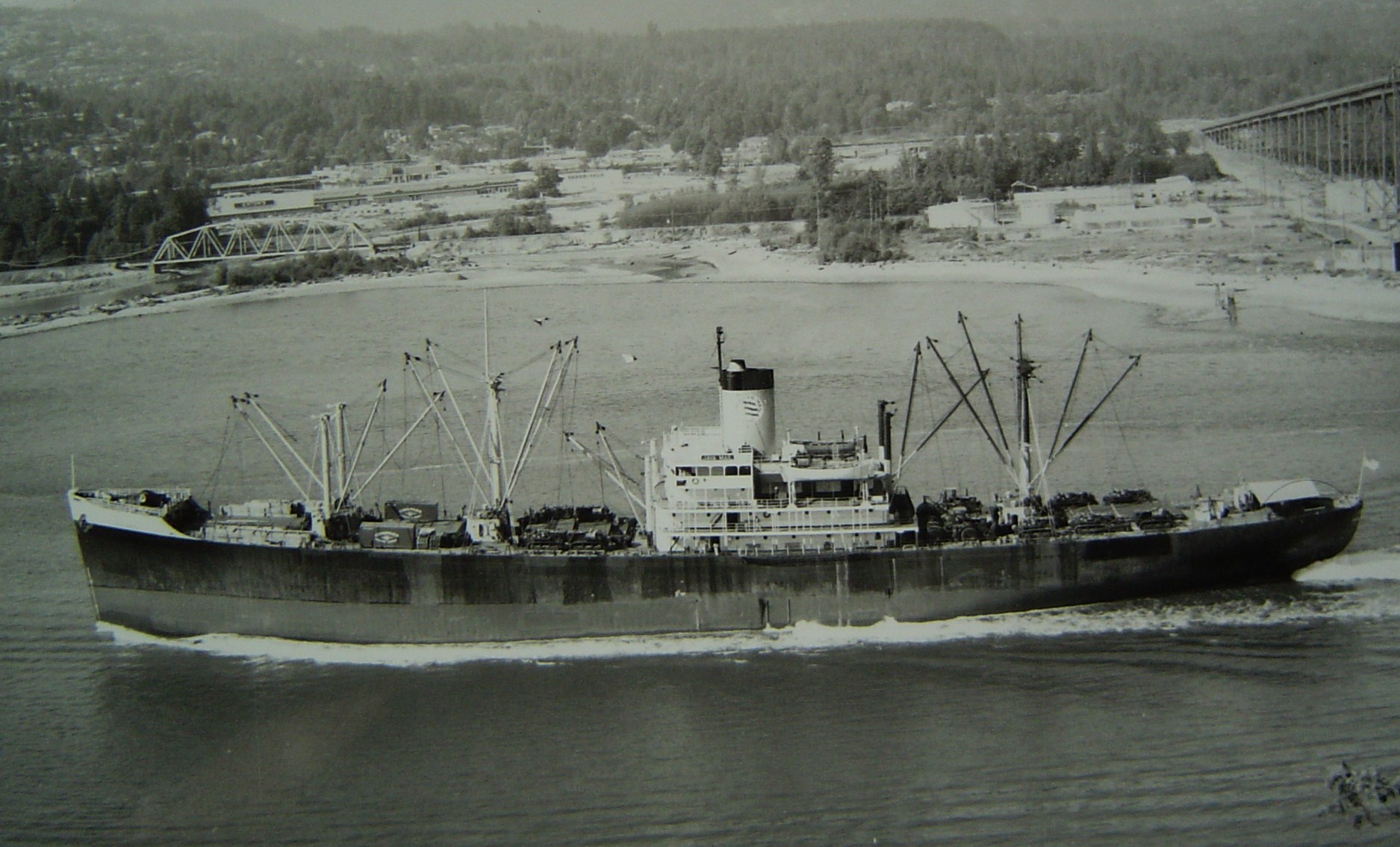 Ex-USS Grafton (APA-109) under way while in merchant service as the American Mail Lines SS Java Mail departing Vancouver, B.C. circa late-1950s-early-1960s. |