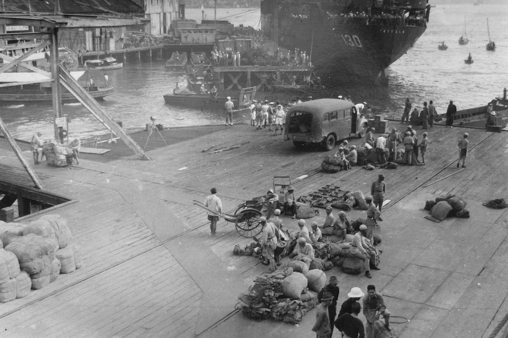 138k | Chinese Nationalist Army troops being loaded aboard USS Attala (APA-130) and USS Hanover (APA-116)