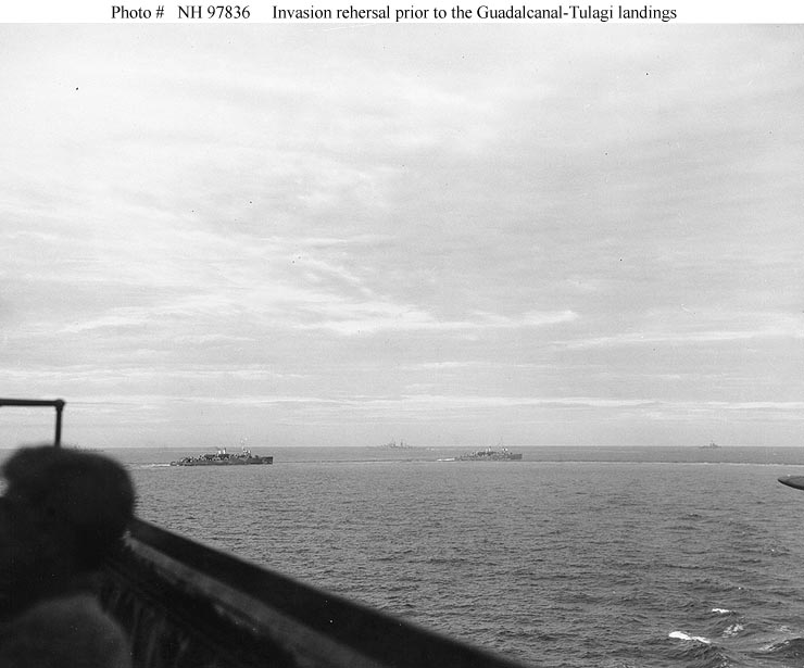 practice landings in the Fiji Islands, 30 July 1942, shortly before the invasion of Guadalcanal and Tulagi. Note the light cruiser beyond them, possibly