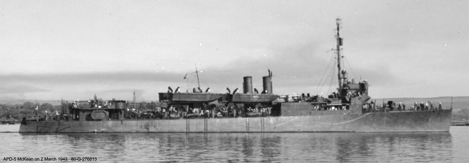 94k | USS McKean (APD-5) underway, 2 March 1943 US National Archives photo # 80-G-276813 a US Navy photo now in the collections of the US National Archives. |