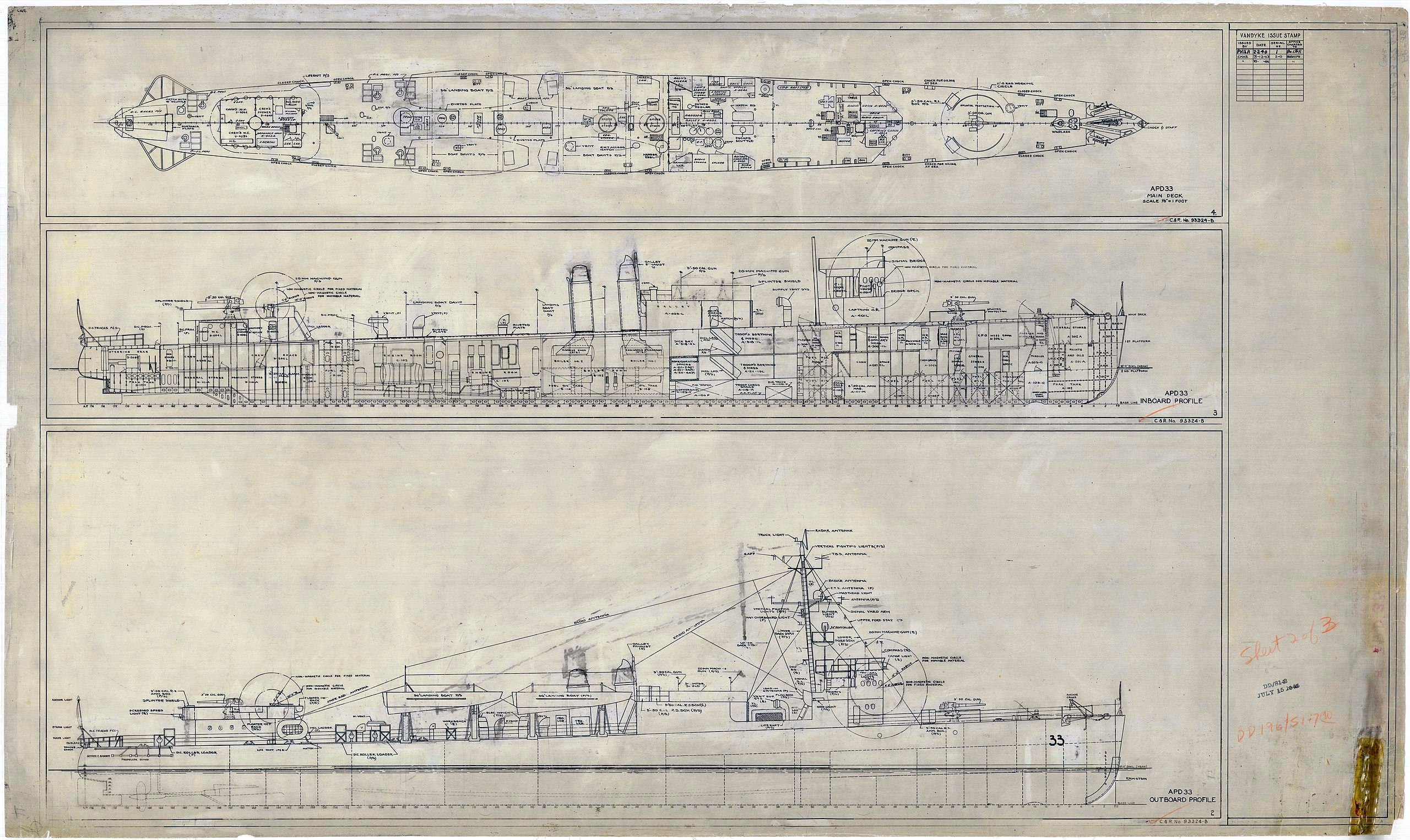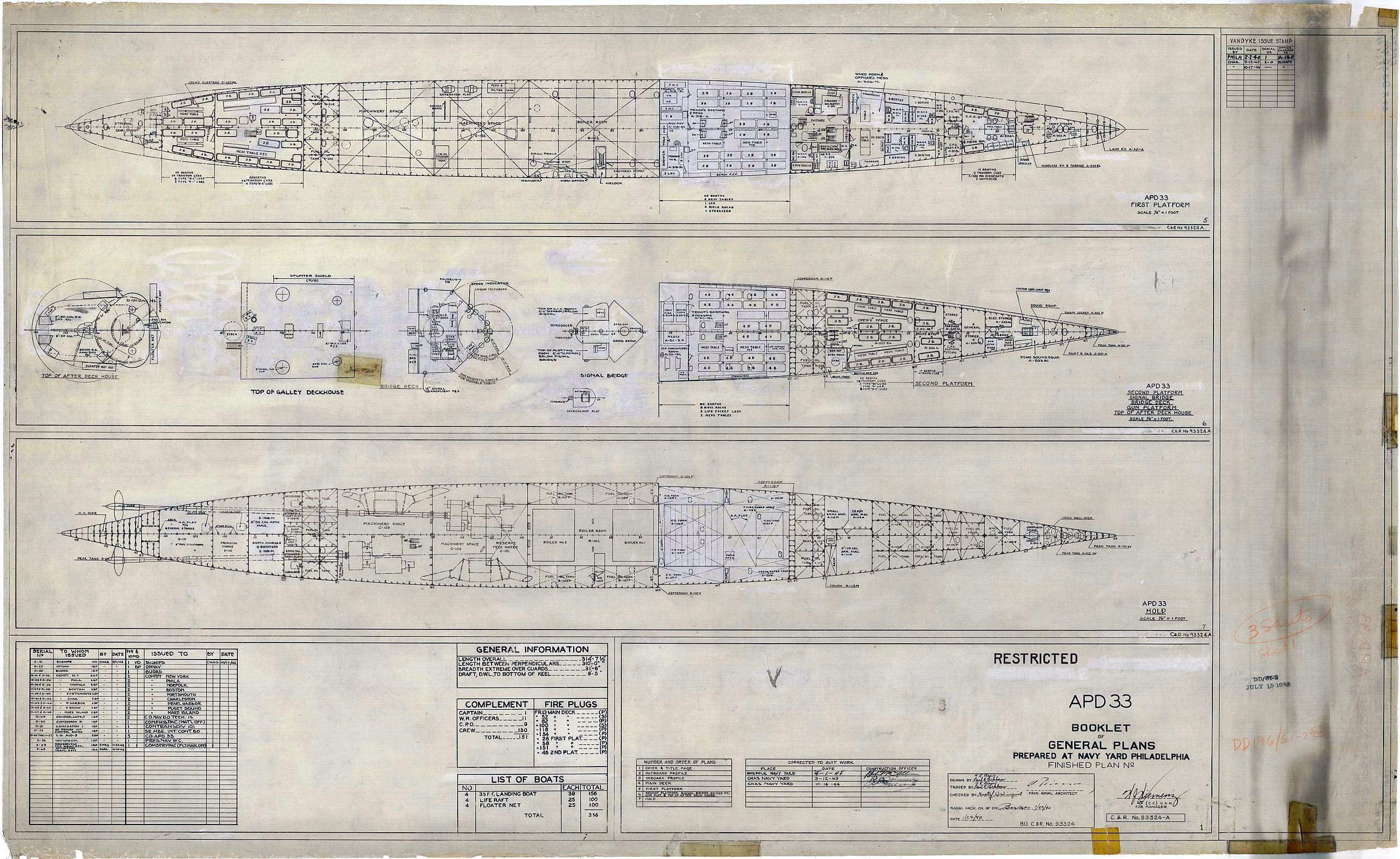191k | USS George E. Badger (APD-33) Booklet of General Plans - Schematic 1 - Main Deck / Inboard Profile / Outboard Profile.