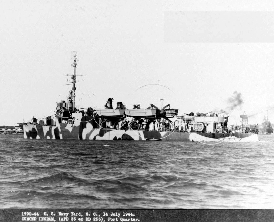 144k | USS Osmond Ingram (APD-35) off Charleston Navy Yard, S.C., 14 July 1944. She is painted in Camouflage Measure 31,