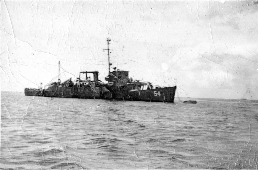 USS Chase (APD-54) moored to a buoy at Kerama Retto sometime after 20 May 1945. Chase fired successfully on a diving kamikaze, but had to maneuver violently to avoid the falling craft. It splashed, a scant 10 yards from the ship, and the explosion of the two bombs it carried ripped Chase 's hull open, flooding the engine and fire rooms. With her steering gear jammed at hard left rudder, Chase drove off another suicide plane. Listing so badly as to be in danger of capsizing, she was kept afloat by the skillful work of her crew and towed into Kerama Retto for repairs |