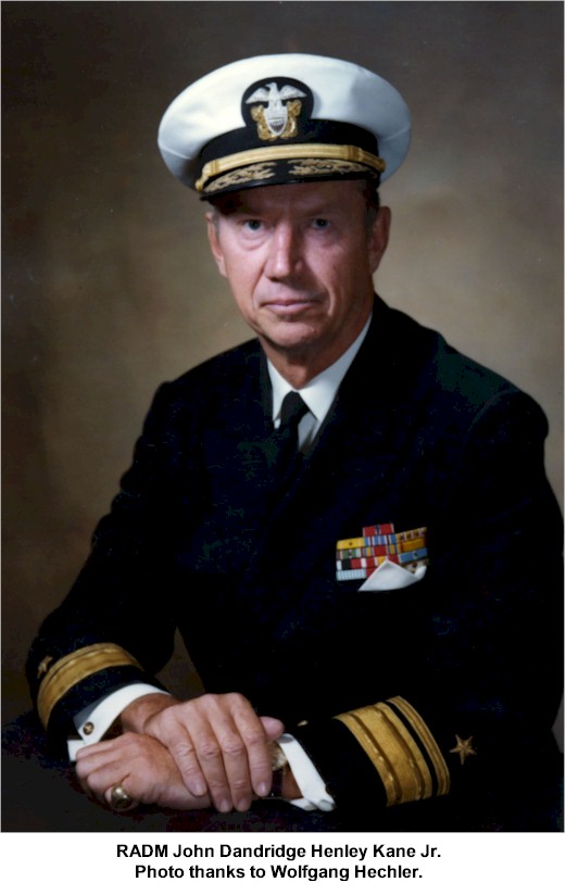 RADM John D. H. Kane, Jr. USN, Ret. of McLean, Virginia, died August 6, 2013, at Sunrise-Foxhill, Bethesda, Maryland, where he has lived since 2010. John Dandridge Henley Kane, Jr., was born in Newport, RI, the son of Cordelia Pringle Kane and Capt. John D.H. Kane of the U.S. Navy. He descended from a long line of Naval officers, dating to his namesake, John Dandridge Henley, who was appointed to the Naval Academy by George Washington in 1799.