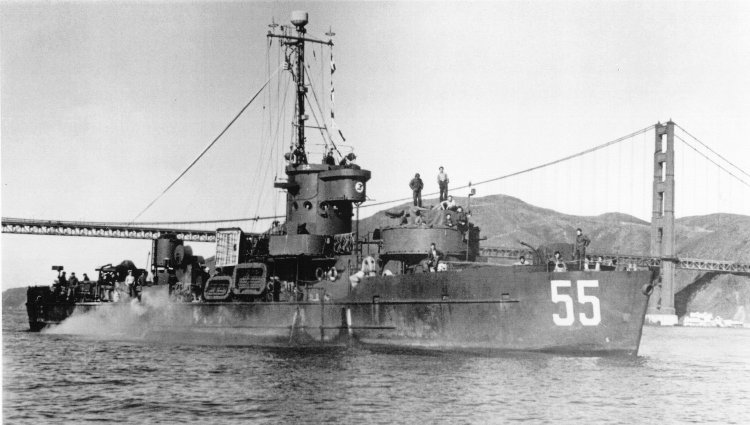 60k | USS LCS(L)(3)-55 passes under the Golden Gate Bridge at San Francisco as she returns home, circa late 1945, early 1946. | National Association of USS LCS(L) 1-130 Courtesy John Palco | |