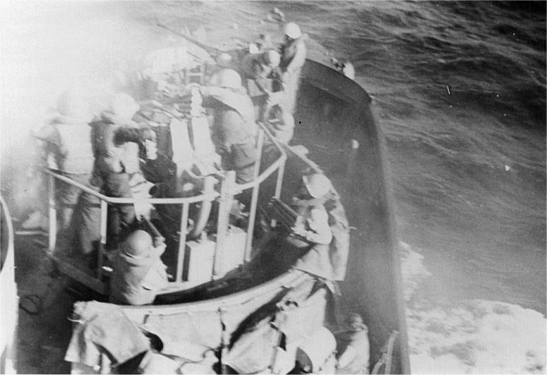 75k | USS LCS(L)(3)-55 in action off Okinawa while on picket duty at Radar Station No.10. Guns # 1 and # 2 firing at during a kamikaze attack, date unknown. | Submitted by John Carmony, Courtesy Lou Plant SM1/c USS LCS(L)(3)-55 | |