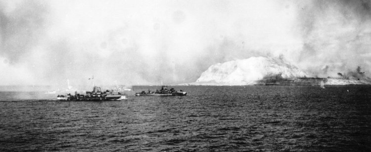 44k | USS LCS(L)(3)-56 and USS LCS(L)(3)-55 strafing the beach at Iwo Jima, 19 February 1945. National Archives photo |