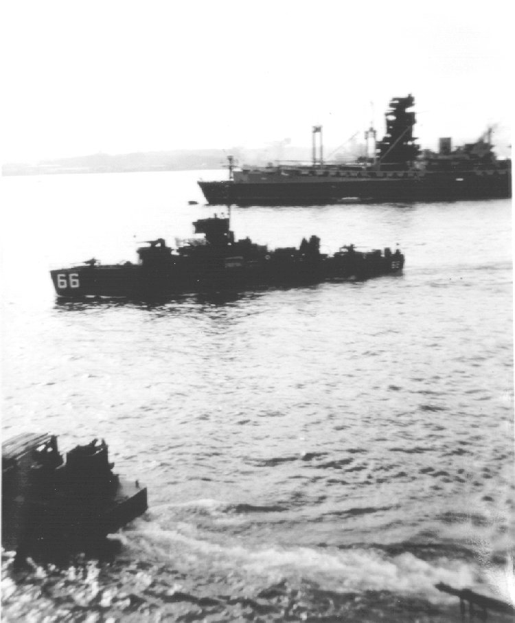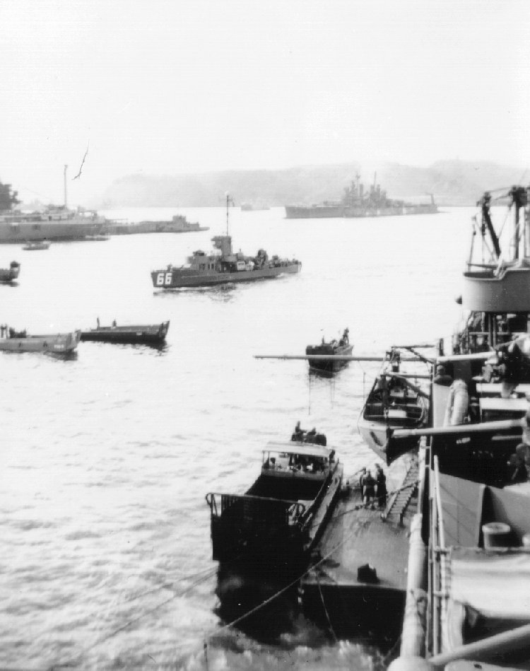 88k | USS LCS(L)(3)-66 under way at Yokosuka, Japan, circa late 1945 or January 1946. Note the Japanese battleship HIJMS Nagato in the background. | National Association of USS LCS(L) 1-130 |