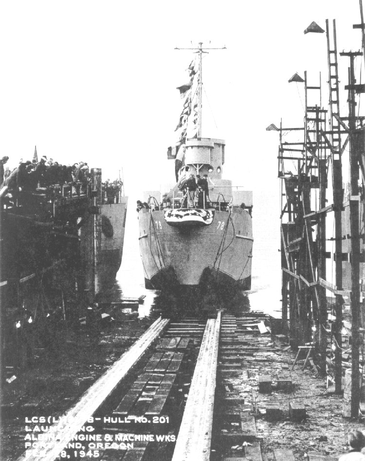 144k | Builders photo, launch of LCS(L)(3)-78 at Albina Engine and Machine Works, Inc., Portland, OR., 28 February 1945 |