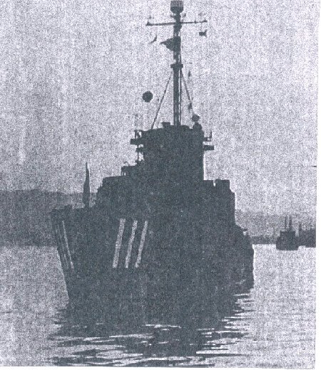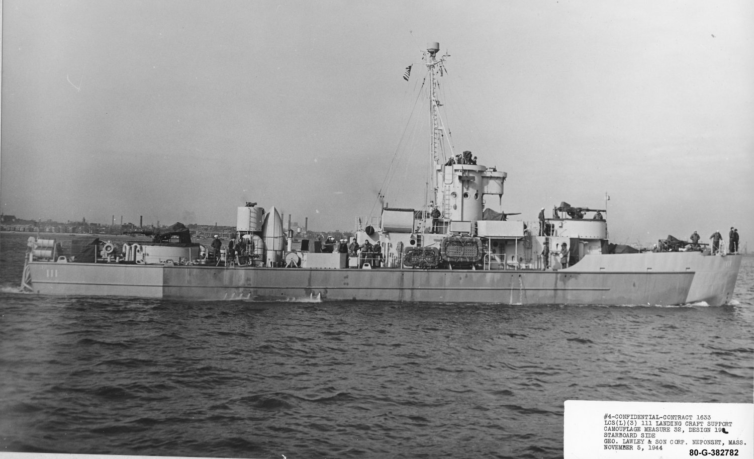 Starboard side view of USS LCS(L)(3)-111 under way during builders trials, 5 November 1944. George Lawley & Sons Corp,