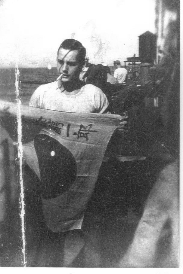 Donald H. Anderson F 1/c aboard USS LCS(L)(3)-111 while off Okinawa, 12 April 1945. |